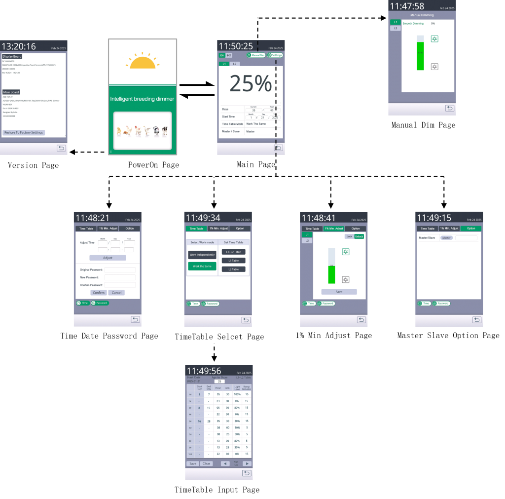 1 Screen 600×1024 IPS capacitive touch screen, display the dimming brightness of the dimming controller, working status and parameter configuration.