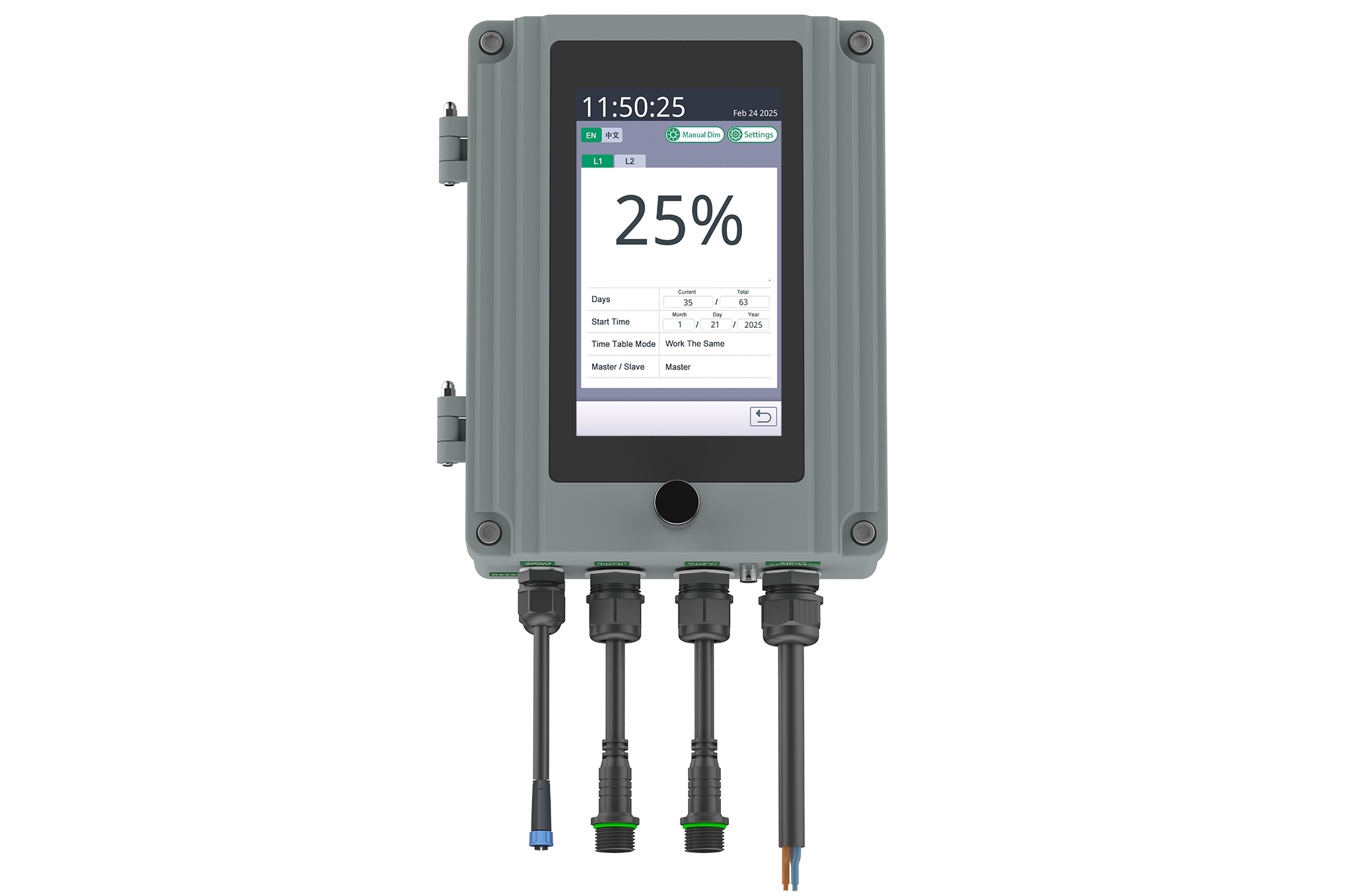 The built-in timetable feature automatically adjusts the brightness of the LED lights based on a preset schedule, optimizing the management of the breeding cycle. Additionally, the controller can integrate with the 0-10V signal from an upper-level breeding controller, allowing the brightness of the LED lights to be controlled by the primary system.