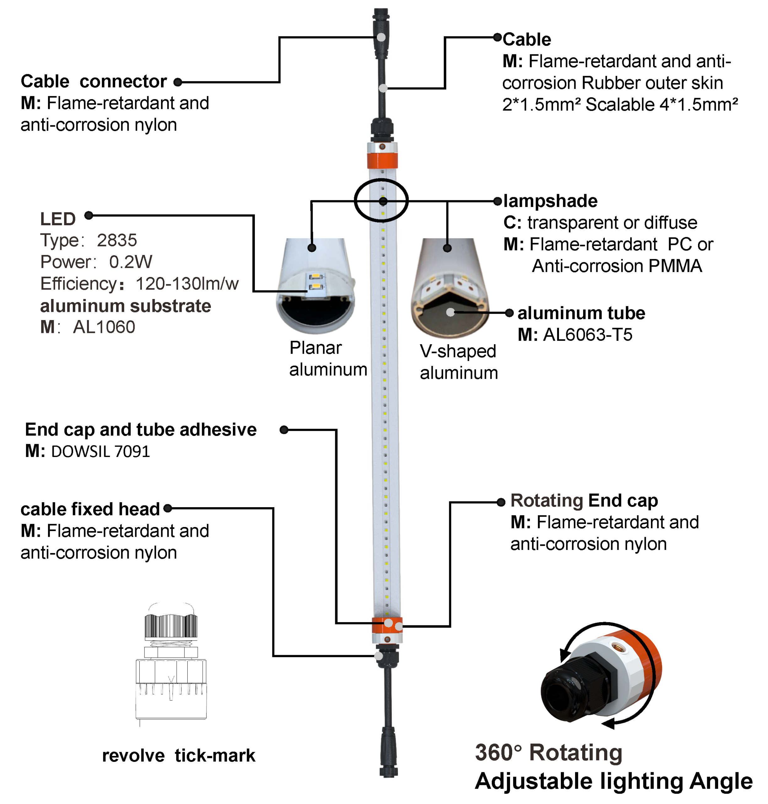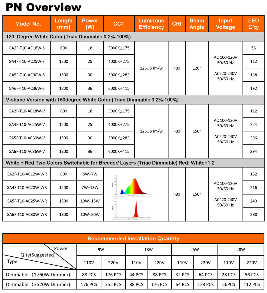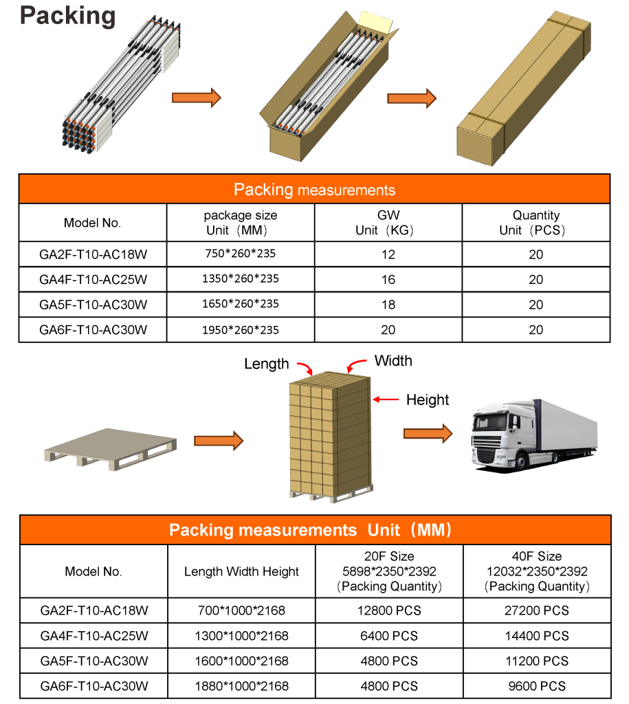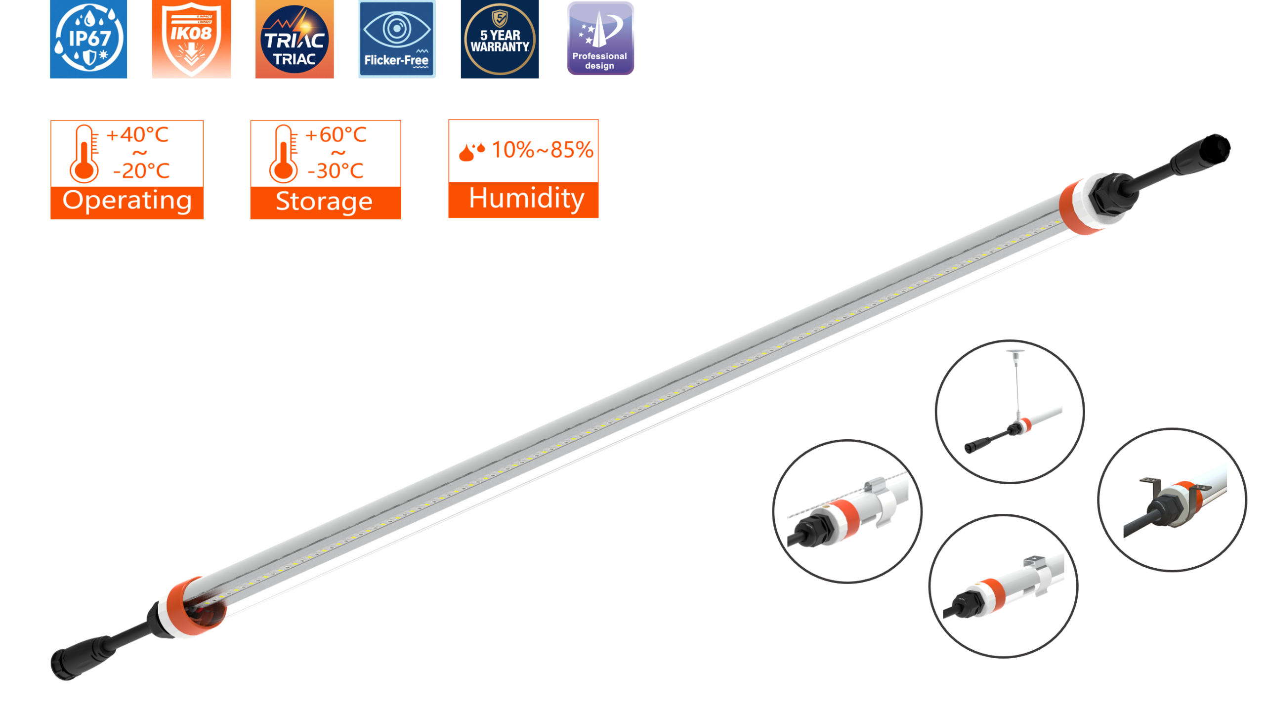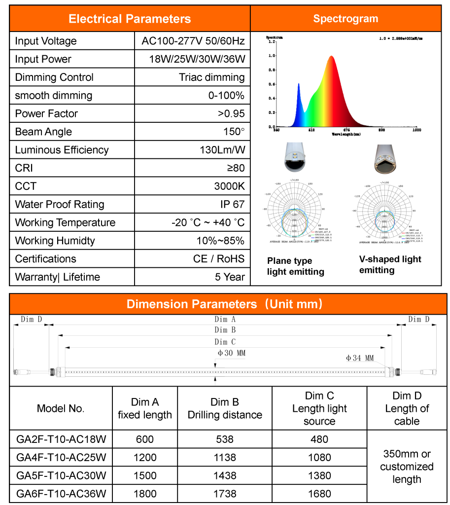 18W~30W,0-100% TriAC Dimming,130Lm/W,IP67 WaterProof,Rotatable Illumination Angle,Plug-and-Play Easy Installation,T10 Tube Lamp