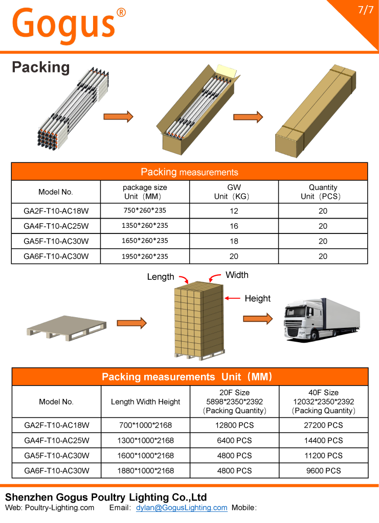 The Gogus T10 tube is designed to meet the ac100~275v AC lighting solution of the breeding farm. It uses patented AC SCR dimming technology, advanced LED technology, IP67 waterproof structure design, rotatable illumination angle plug-and-play easy installation.With Gogus’ dimming controller, it can realize the simulation of sunrise and sunset, adjust the illuminance in different breeding stages, and provide an ideal lighting solution for the life cycle of poultry.