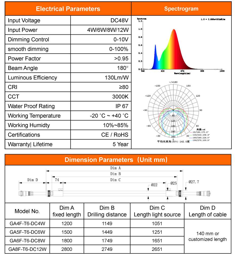 5W~9W,0-100% DC48V Dimming,130Lm/W,IP67 WaterProof,Plug-and-Play Easy Installation,T6 Tube Lamp