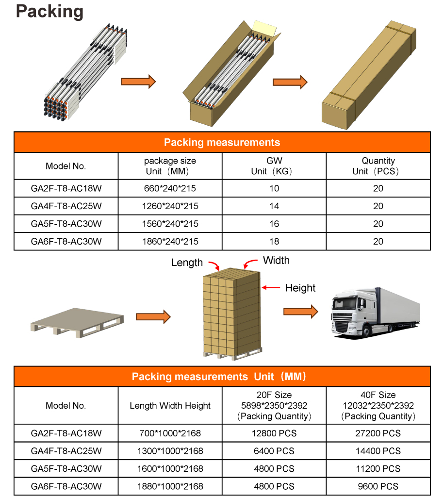 18W~30W,0-100% TriAC Dimming,120Lm/W,IP67 WaterProof,Rotatable Illumination Angle,Plug-and-Play Easy Installation,T8 Tube Lamp